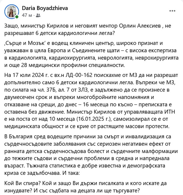 Нека подкрепим призива на д-р Дария Бояджиева, специализант по сърдечносъдова образна диагностика в ‚Сърце и Мозък‘ Бургас, за разкриването на 6 детски кардиохирургични легла на територията на Бургас.